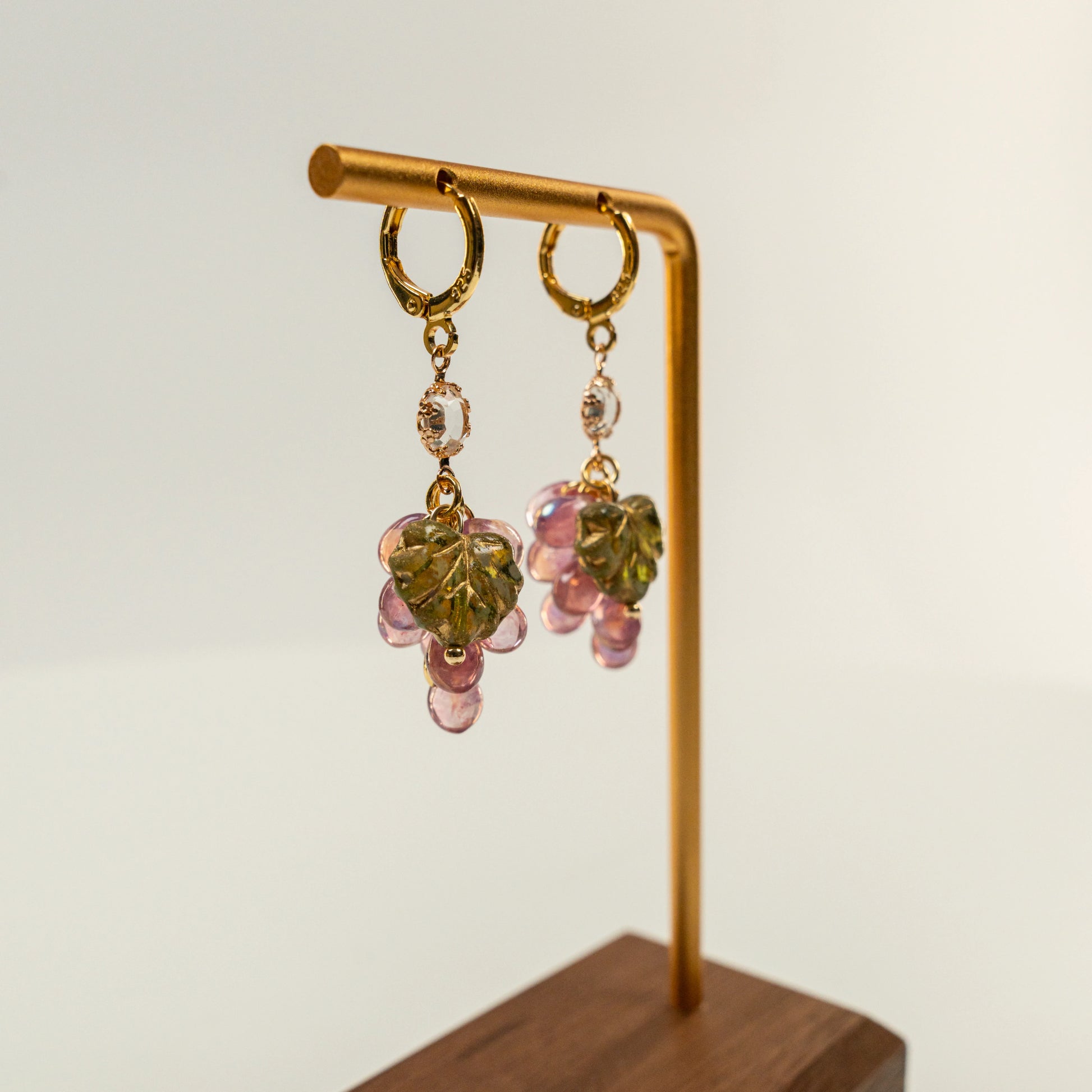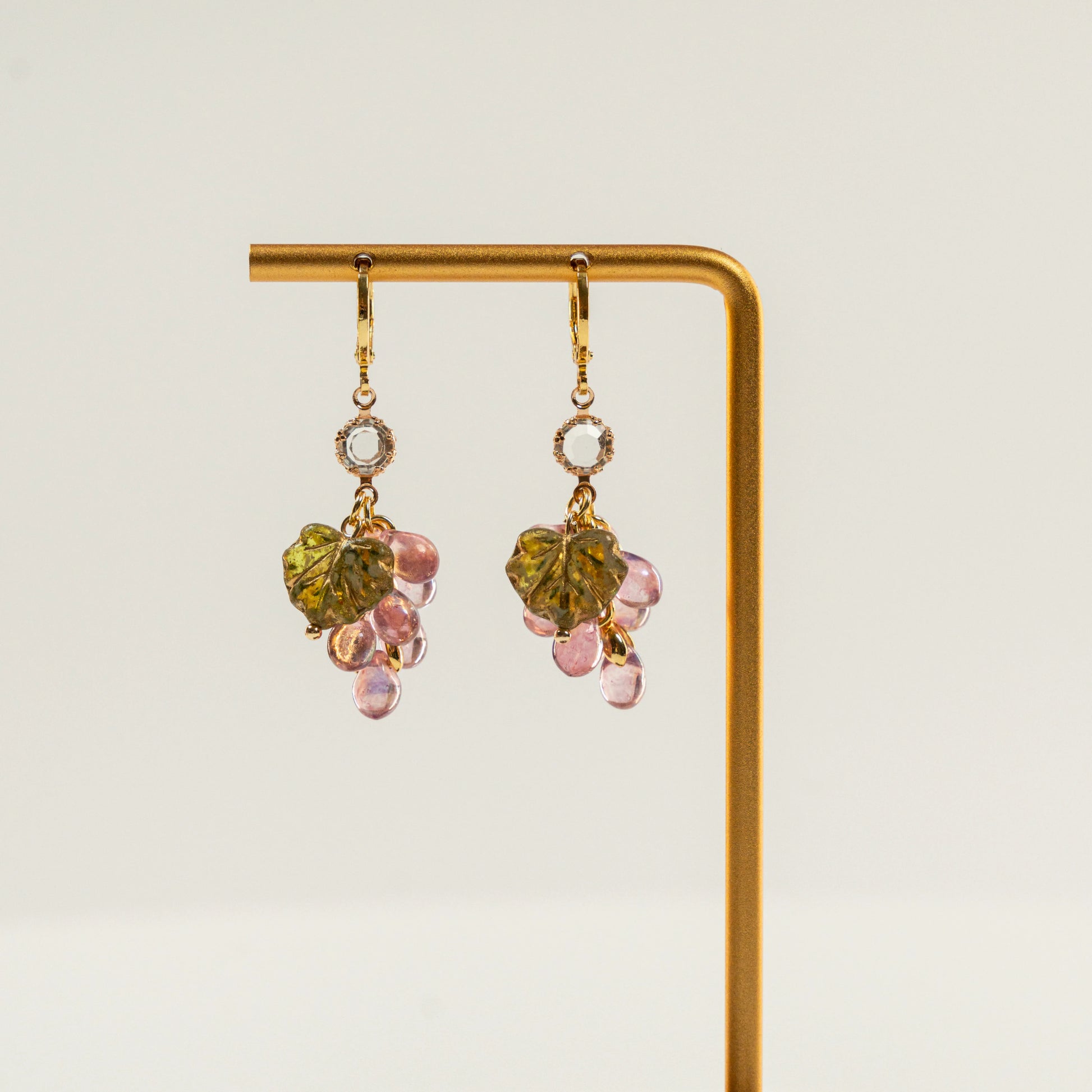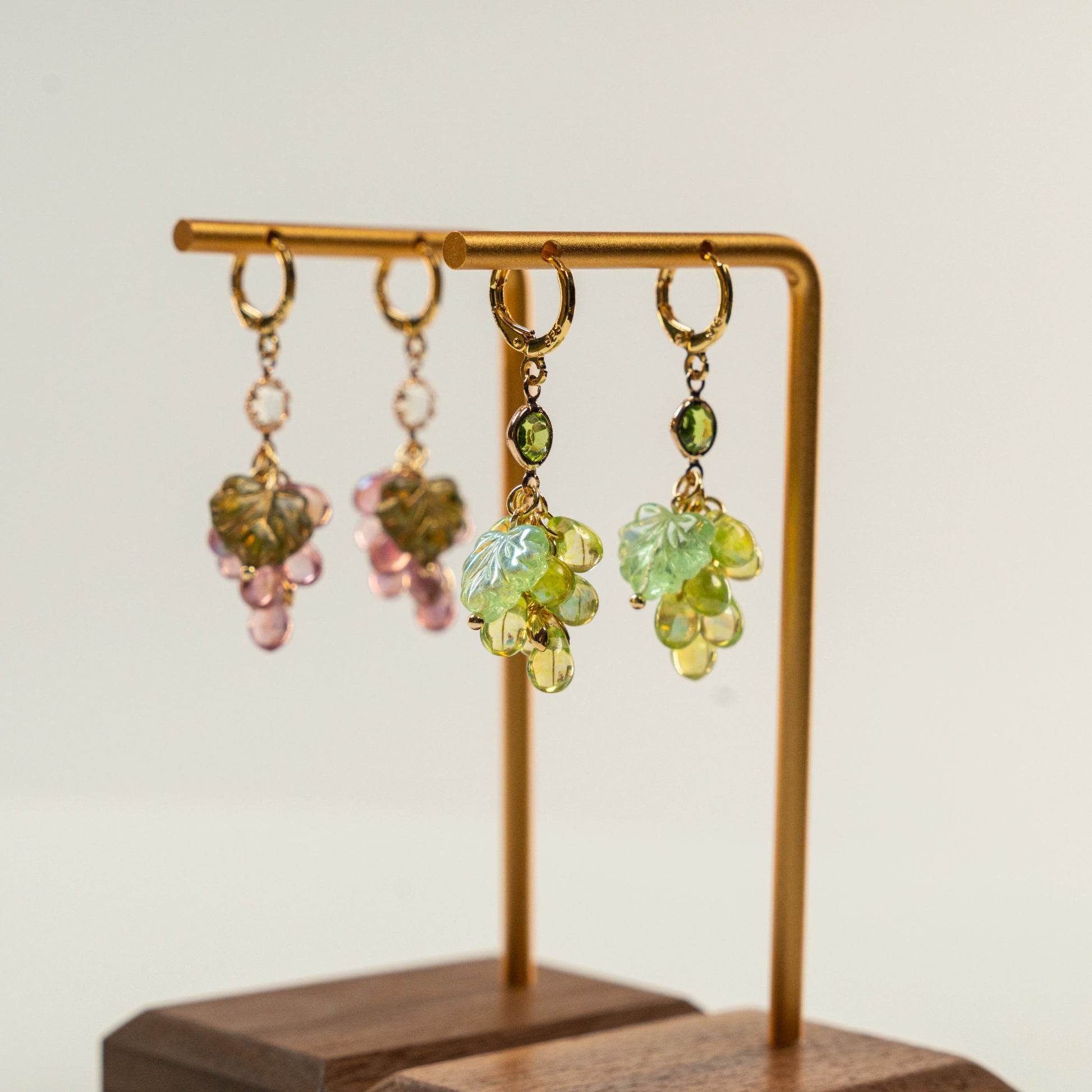 Playful grape-shaped earrings structured with translucent teardrop beads in shades of purple and green.