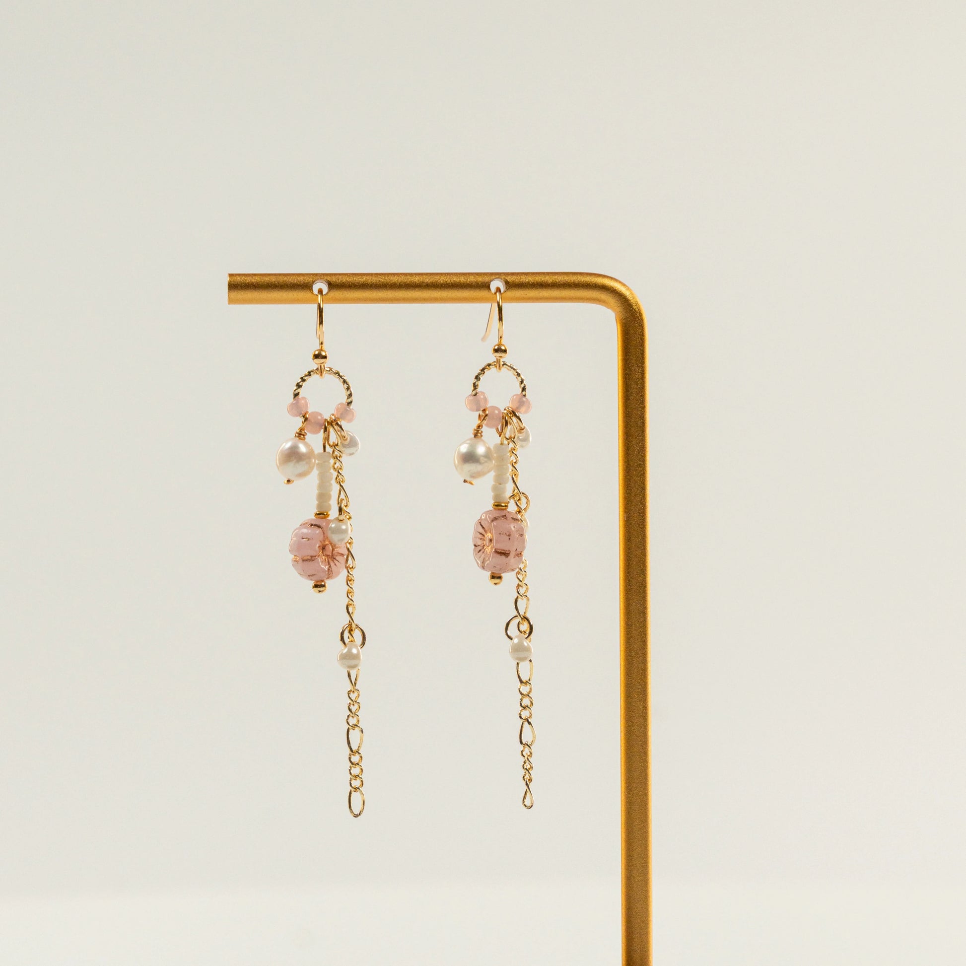 Spring-inspired earrings featuring delicate pale pink and purple flowers, accented with pearls and a long chain.