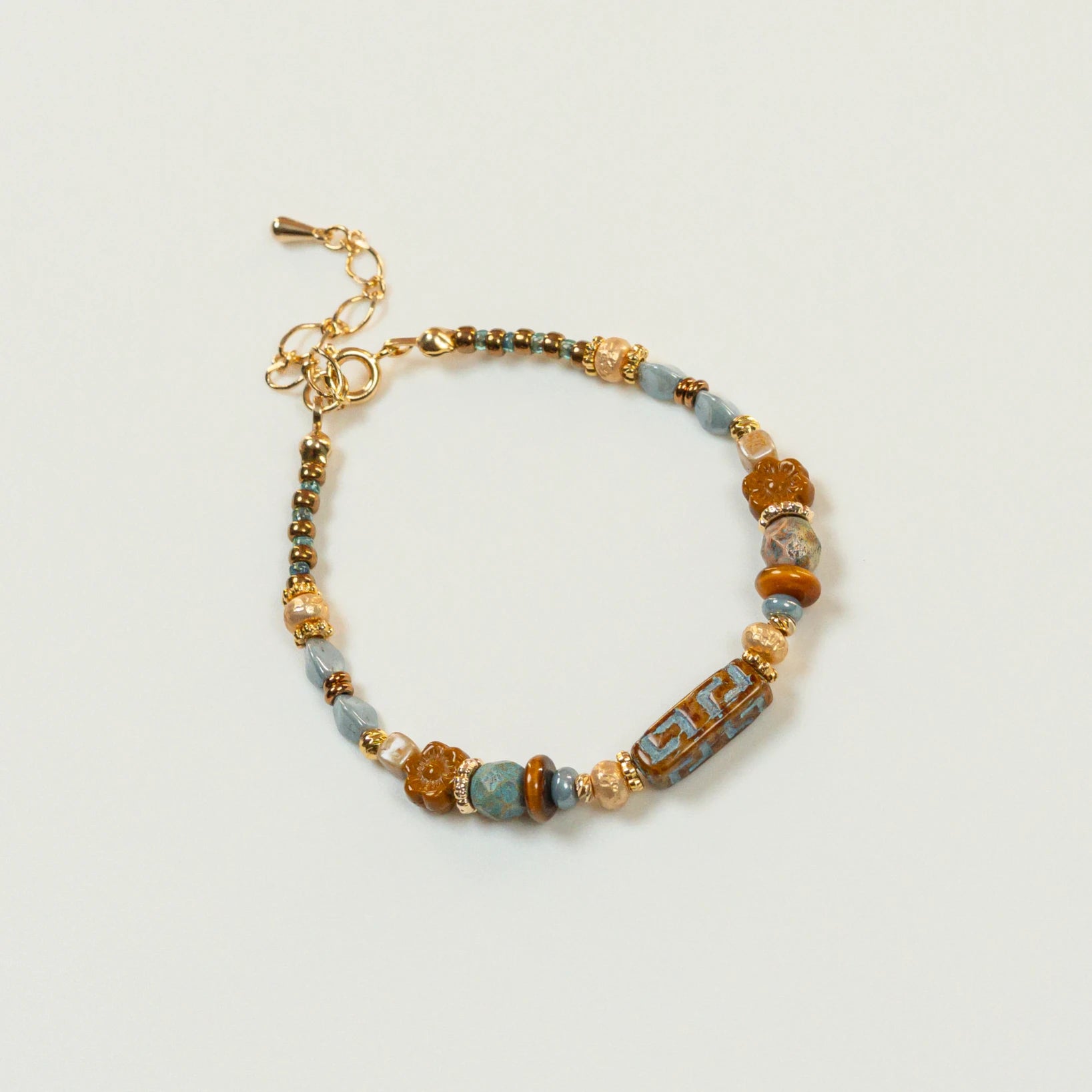 Inspired by desert sandstorms. A blend of baby blue and golden brown swirling like air and earth in motion. Centered with a Roman meander bead.