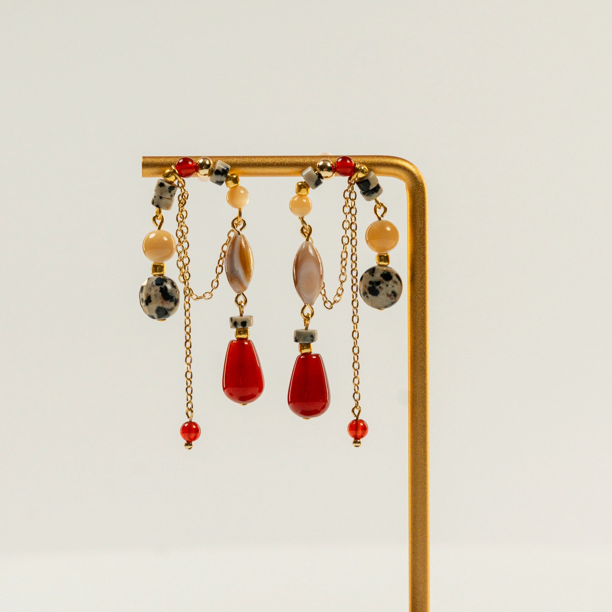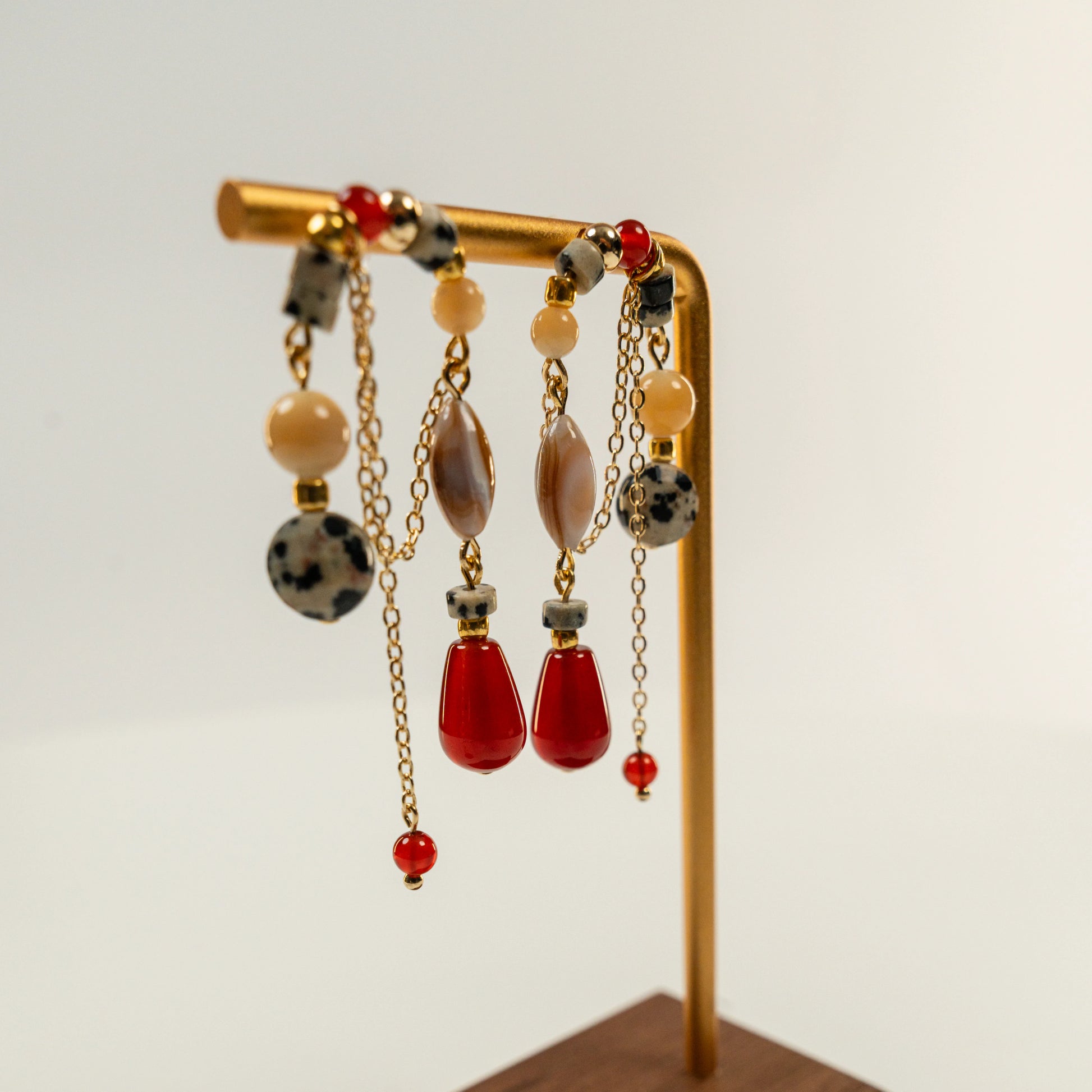 Earrings featuring red agate, nacre, and natural stones with delicate chain tassels, elegant, flowing, and full of graceful movement.