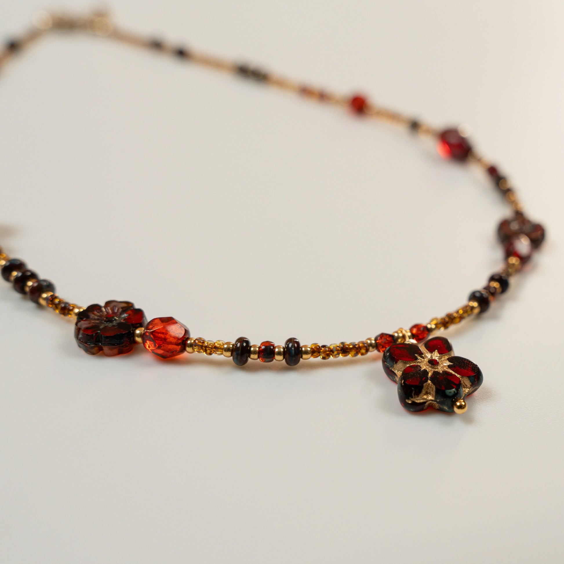 A necklace of warm crimson blooms and amber tones. Mysterious and magical, like something a forest witch might wear in the fading light.