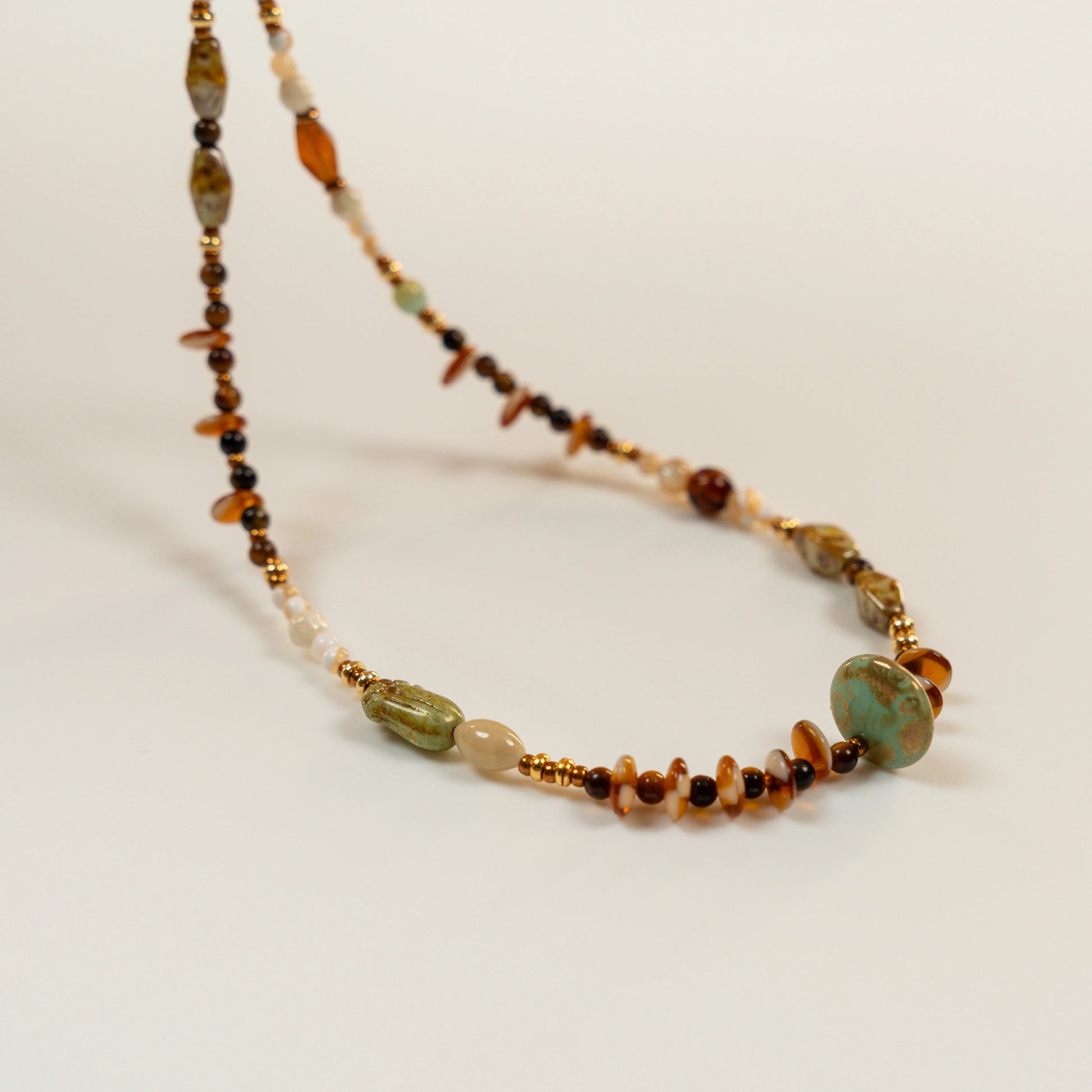 Materials: Czech glass beads, Japanese Miyuki seed beads, tiger’s eye, and nacre.