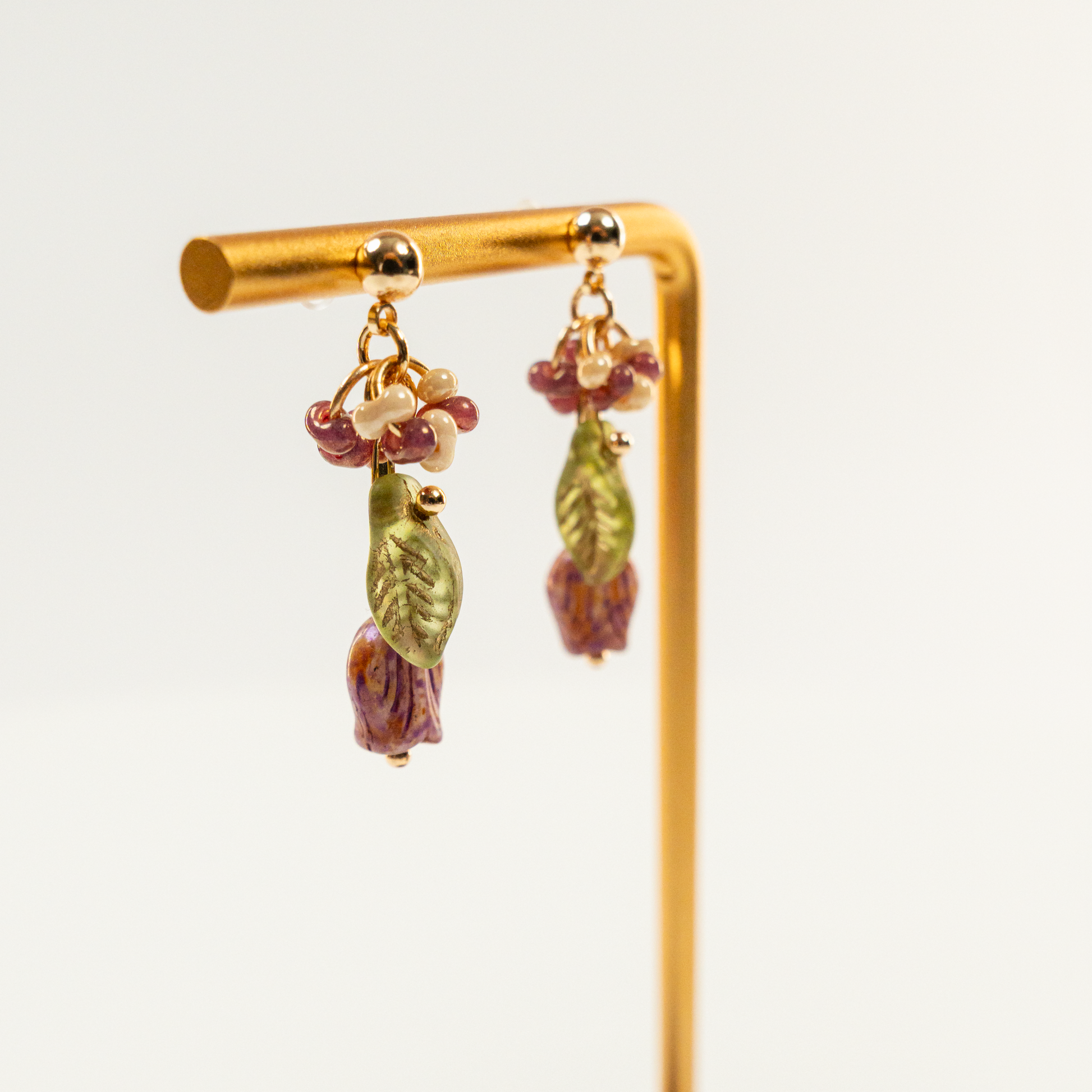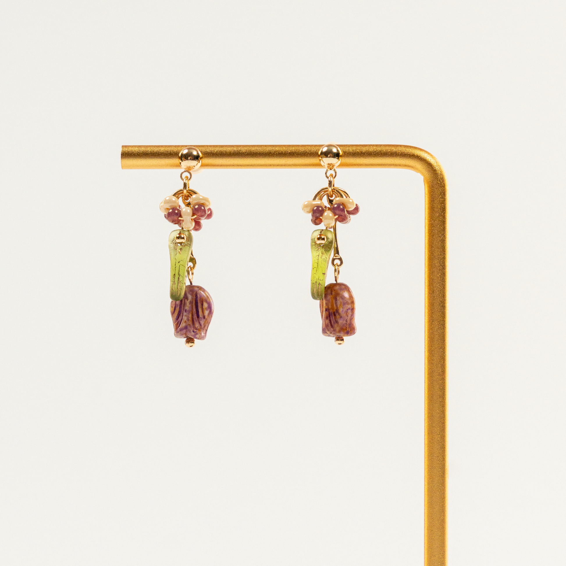 Deze handgemaakte oorbellen in de vorm van een tulp vangen de zachte energie van het voorjaar. De paarse Tsjechische glaskralen zijn zorgvuldig gevormd tot een elegante bloem die licht en fris aanvoelt. Perfect voor wie houdt van subtiele natuuraccenten met een speels tintje.